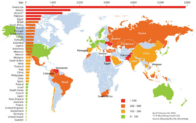 Πρώτη η "επανορθωμένη" μεταΤσάβες Βενεζουέλα με δεύτερη την τρεις φορές "σωσμένη" Ελλάδα των Μνημονίων, σε κίνδυνο αθέτησης πληρωμών ομολόγων (χρέους), στο θερμόμετρο των CDS.